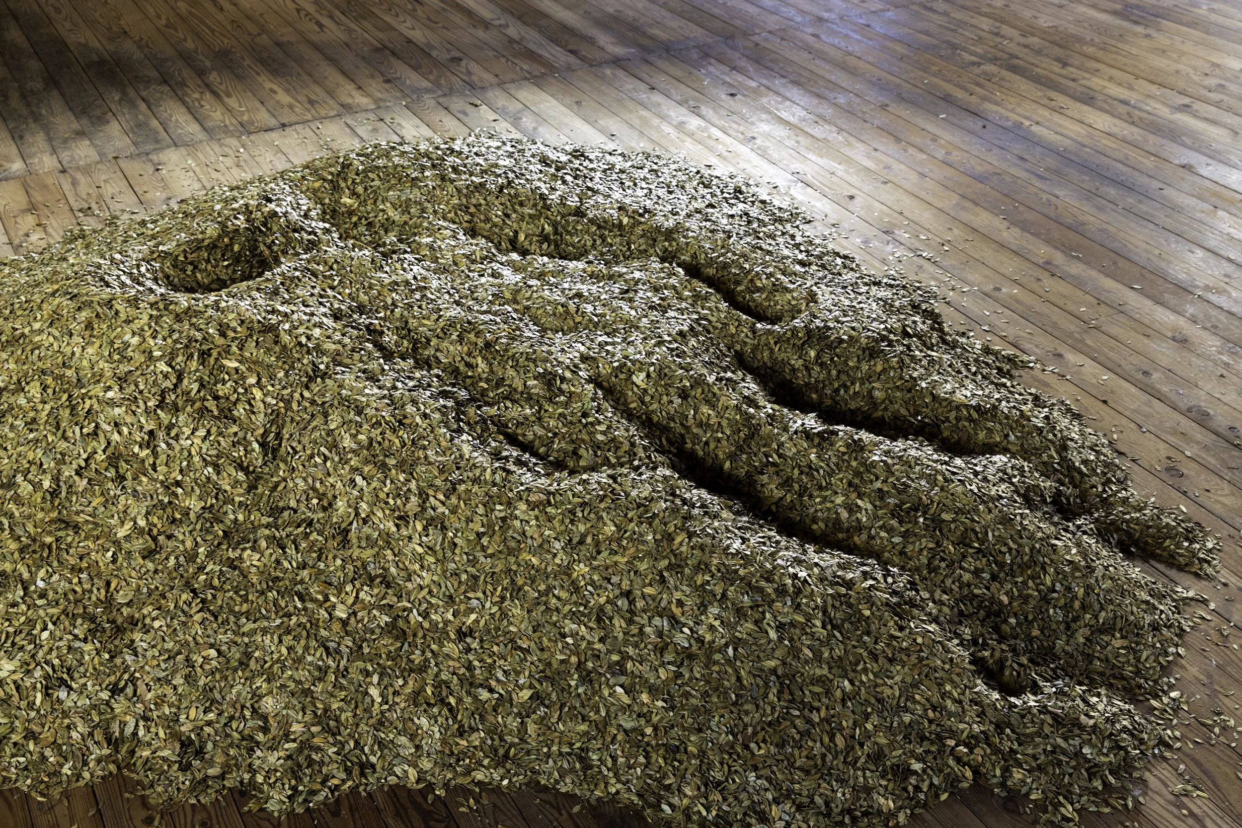 Penone presents Breath of Leaves, 1979, piled up in the adjoining space. The installation records the imprint of the artist’s body and breath in boxwood leaves, pointing to our constant, often invisible exchange with the world around us. Whilst this negative sculpture captures a fleeting interaction, the photographic series Alpi Marittime juxtaposes lasting effects on the natural landscape with an immediate physical sensation. The artist is shown intertwining three young trees, or outlining with a copper wire the diameter of his grip around a growing trunk.