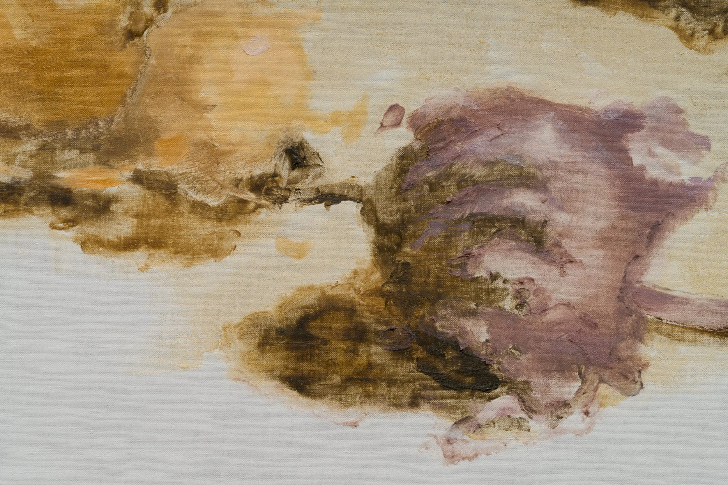 Munk draws from their yellowed varnish an overripe palette of greens, browns, and rosy pink. Lightly perfumed with contemporary materials, her pigment incorporates eye shadow, highlighter, lip gloss, and foundation. Presenting an abstract vanitas, Munk invites parallels between painterly attempts to capture and preserve beauty and the economy of appearance associated with ‘selfies’ today.