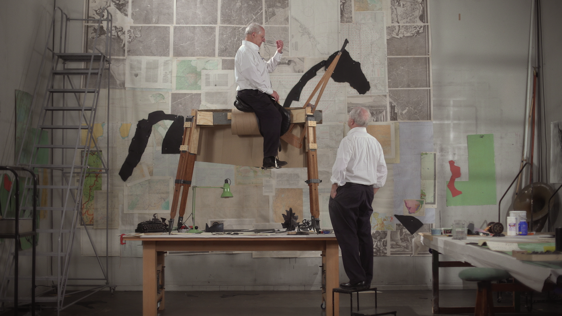 Kentridge welcomes visitors to the palace Entrance Hall with a self-portrait on horseback, which parodies the painted monarchs that parade the walls of the adjacent King’s Room. The cardboard cut-out sits astride a wooden tripod like a makeshift theatre prop. Surrounded by maps and materials from the palace archives, the sculpture calls historical record into question by staging the raw materials through which it’s conveyed.