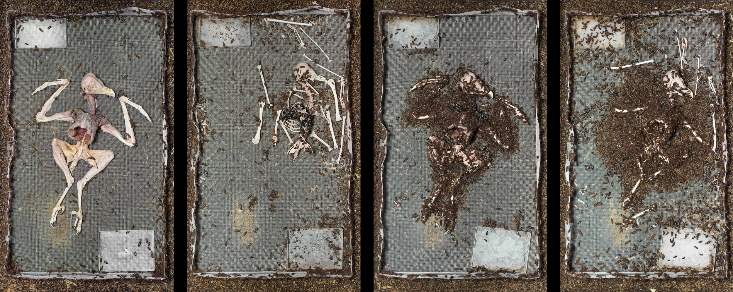 Beyond the palace in the former Corn Barn, Bronwyn Lace evokes the legacy of apartheid through universal forms, rooted in the natural world. Projected from high in the rafters, Feast or Famine shows Southern African carrion beetles feasting on the body of a European Barn Owl. The insects’ frenetic movement illuminates the raw space to the staccato rhythm of time-lapse photography.